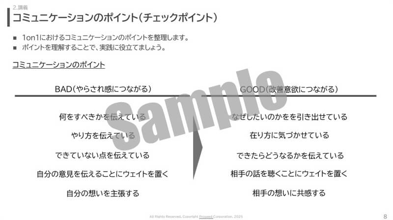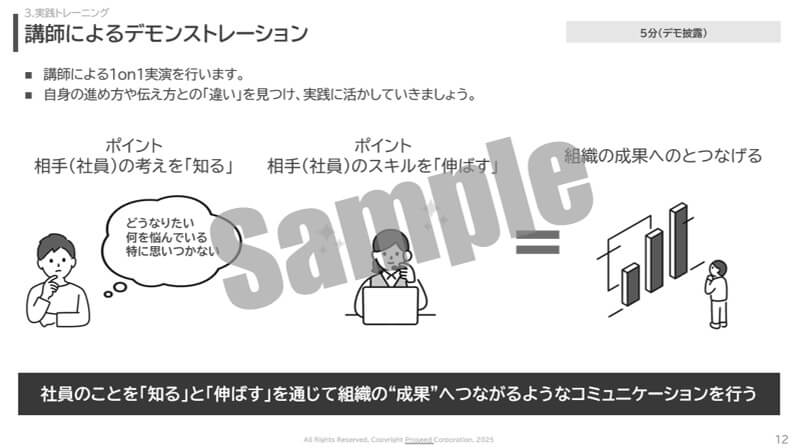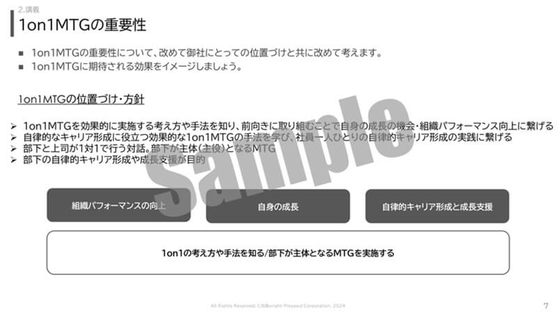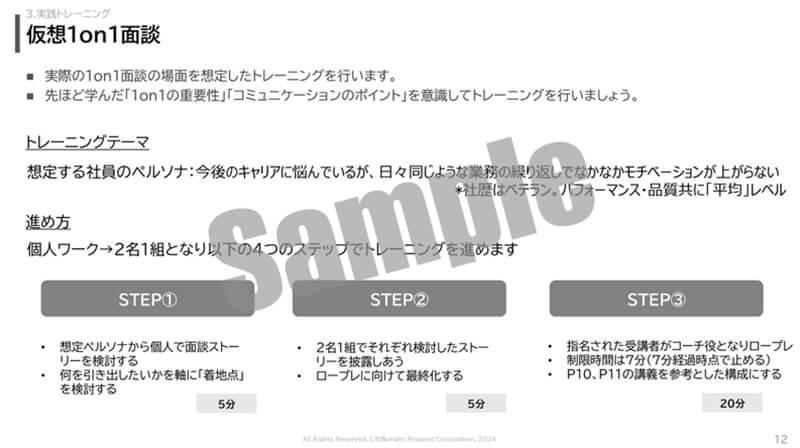 | 2 | 実践トレーニング | ・テーマ1:新人との1on1 ・テーマ2:ベテランとの1on1 ※ケーススタディの内容はご担当者との相談の上決定します |