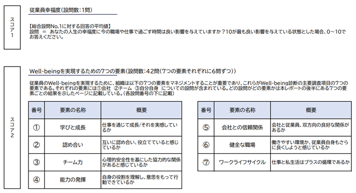 - 調査項目は各年の最新調査から導き出された幸福度向上のためにマネジメントが必要な7つの要素がベース